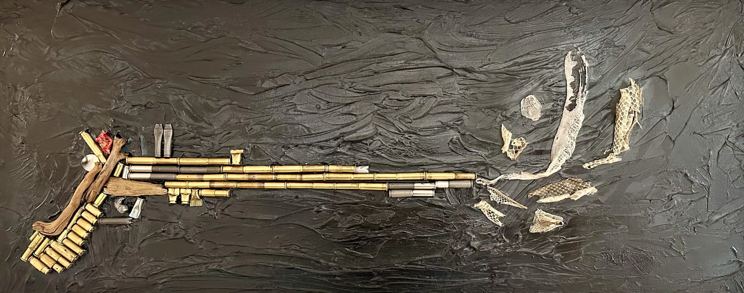 Made from collected woods, spent brass casings and responsibly sourced Hudson Valley Snake Skin. One of kind sculpture on canvas for anyone who loves cool art.